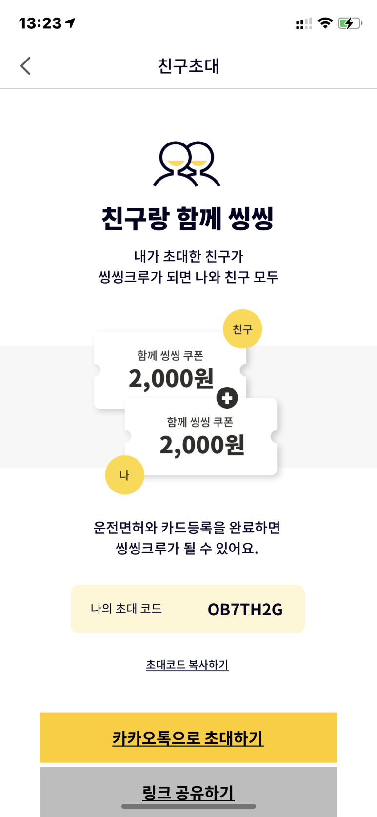 씽씽 타시게 되면 초대 코드 넣고 할인받으시고